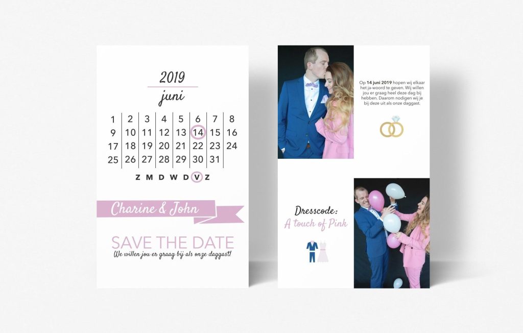 In 2018 kreeg ik de opdracht om een ‘Save the Date’ kaart te maken voor een verloofd stel. Aangezien het stel een persoonlijke kaart wilde, heb ik de foto’s voor op de kaart gemaakt en heb ik de Save the Date kaart ontworpen. De kaart is vervolgens via WhatsApp verstuurd.